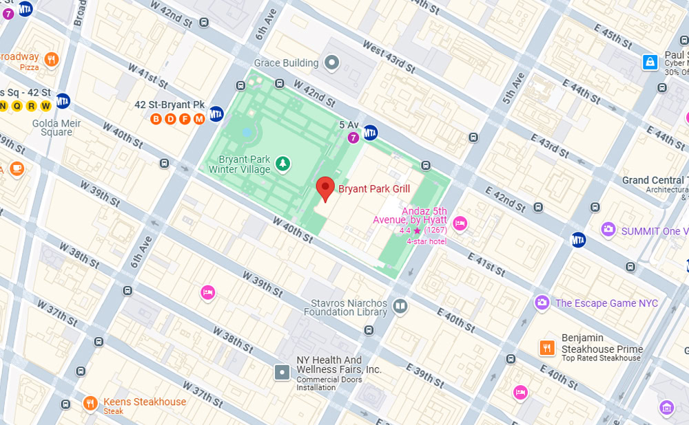 • Location and Accessibility: Bryant Park Grill is centrally located between 40th and 42nd Streets, behind the New York Public Library. It is easily accessible via subway, with major lines such as B, D, F, M, and 7 just steps away. For out-of-towners, it’s conveniently close to Grand Central Terminal and many nearby hotels.